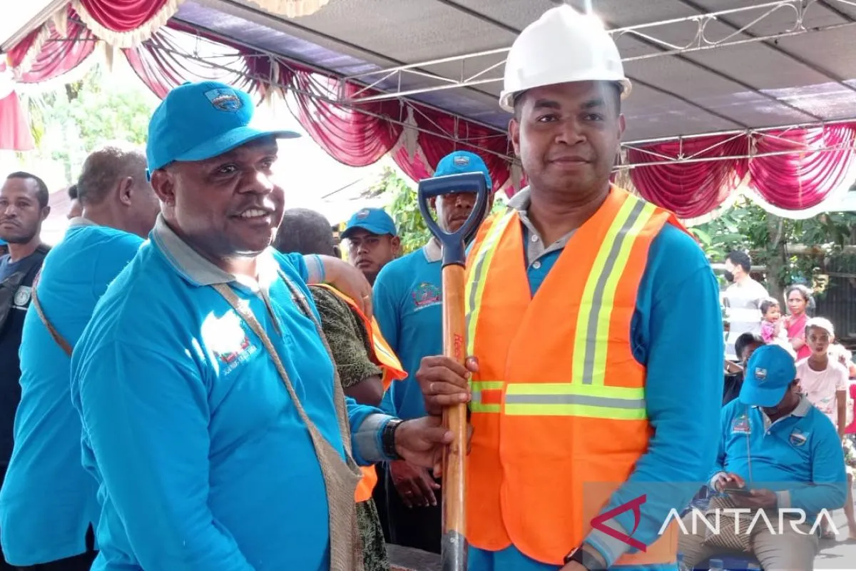 Bupati Manokwari Hermus Indou menyerahkan perangkat kerja berupa sekop dalam rangka memperbaiki jalan lingkungan di sejumlah kawasan dalam perkotaan, Kamis (3/11/2022). (ANTARA/Rachmat Julaini)