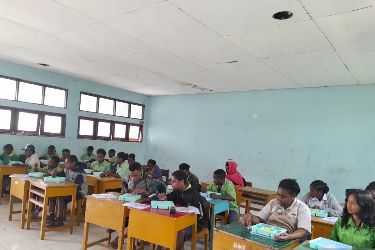 Para siswa-siswi orang asli Papua (OAP) dan non OAP salah satu SMP di Kabupaten Jayawijaya bersiap menyantap makanan yang telah disiapkan oleh dapur program Makan Bergizi Gratis atau MBG di daerah setempat. ANTARA/HO-Dok SPPG Papua Pegunungan.