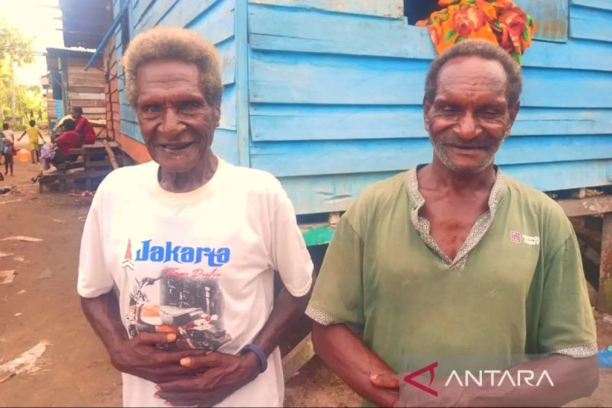 Dua orang pengukir kayu dari Kampung Kokonao, Distrik Mimika Barat yaitu Amandus Utamakope (kiri) dan Antonius Take (kiri). ANTARA/Marsel Balawanga
