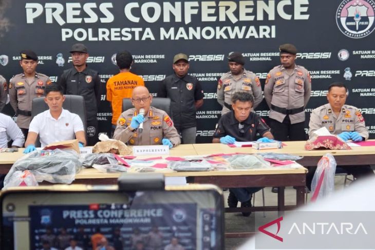 Kepolisian Resor Kota Manokwari menggelar konferensi pers pengungkapan kasus pembunuhan berencana terhadap istri seorang pegawai KPP Pratama Manokwari di Manokwari, Papua Barat, Rabu (12/11/2025). ANTARA/Fransiskus Salu Weking