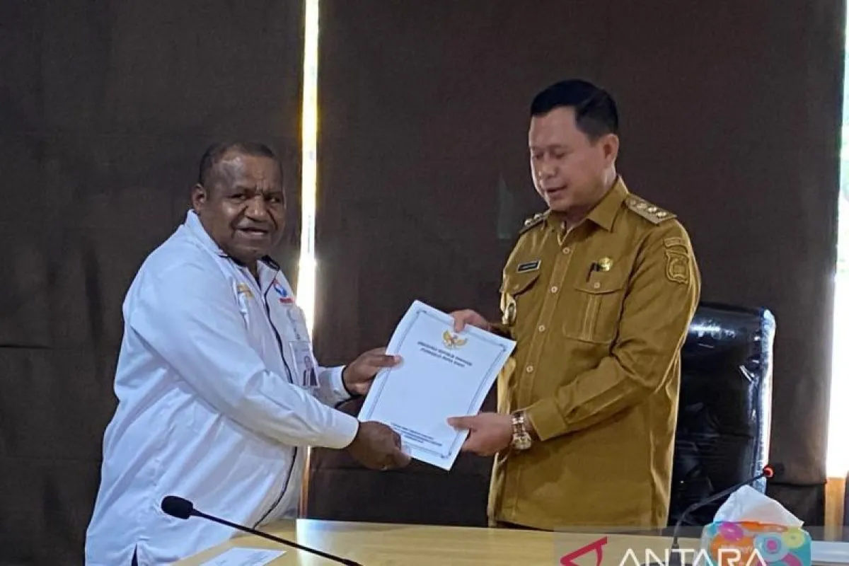 Kepala Ombudsman Perwakilan Papua Barat, Amus Atkana menyerahkan dokumen penanganan sampah dan ODGJ kepada Wakil Wali Kota Sorong Anshar Karim, Senin (15/12/2025). ANTARA/HO-Dinas Kominfo Kota Sorong.