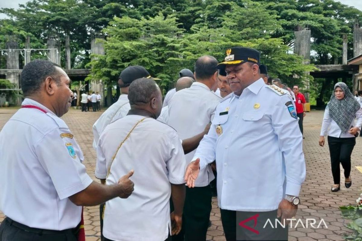Bupati Manokwari Hermus Indou menyalami kepala OPD di lingkup Pemkab Manokwari saat apel ASN perdana tahun 2026 di Kantor Bupati Manokwari, Papua Barat, Rabu (7/1/2026). ANTARA/Ali Nur Ichsan
