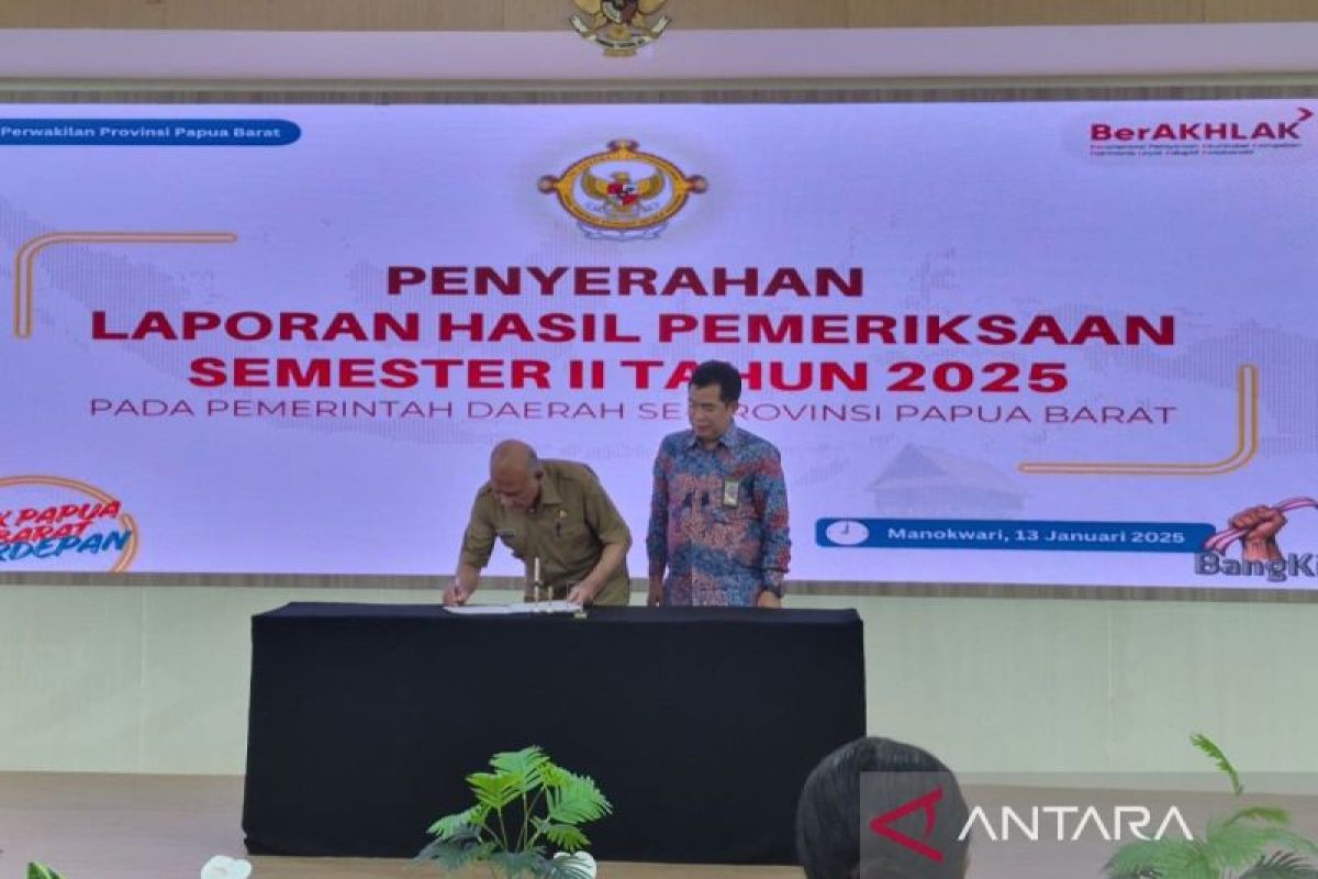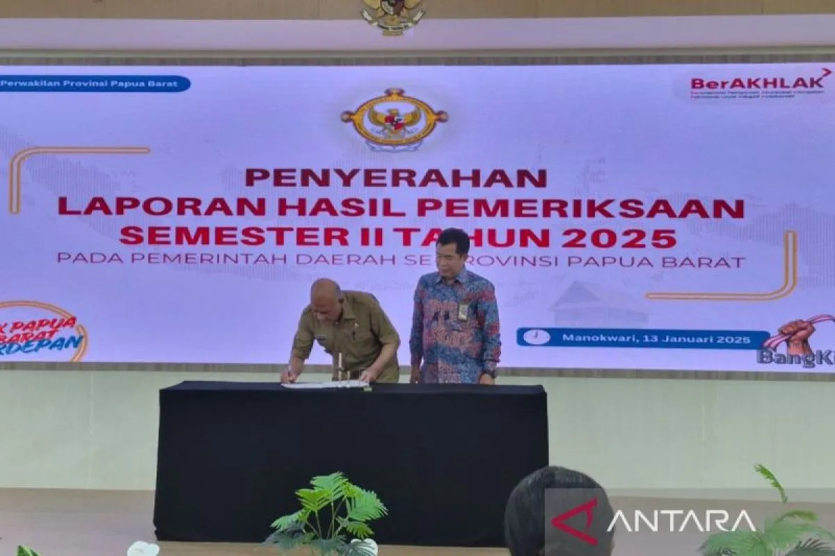 Kepala BPK Perwakilan Provinsi Papua Barat Agus Priyono (kanan) bersama Bupati Kaimana Achmad Hasan menandatangani berita acara penyerahan laporan hasil pemeriksaan kinerja manajemen aset semester II tahun 2025 di Manokwari, Selasa (13/2/2025). ANTARA/Fransiskus Salu Weking