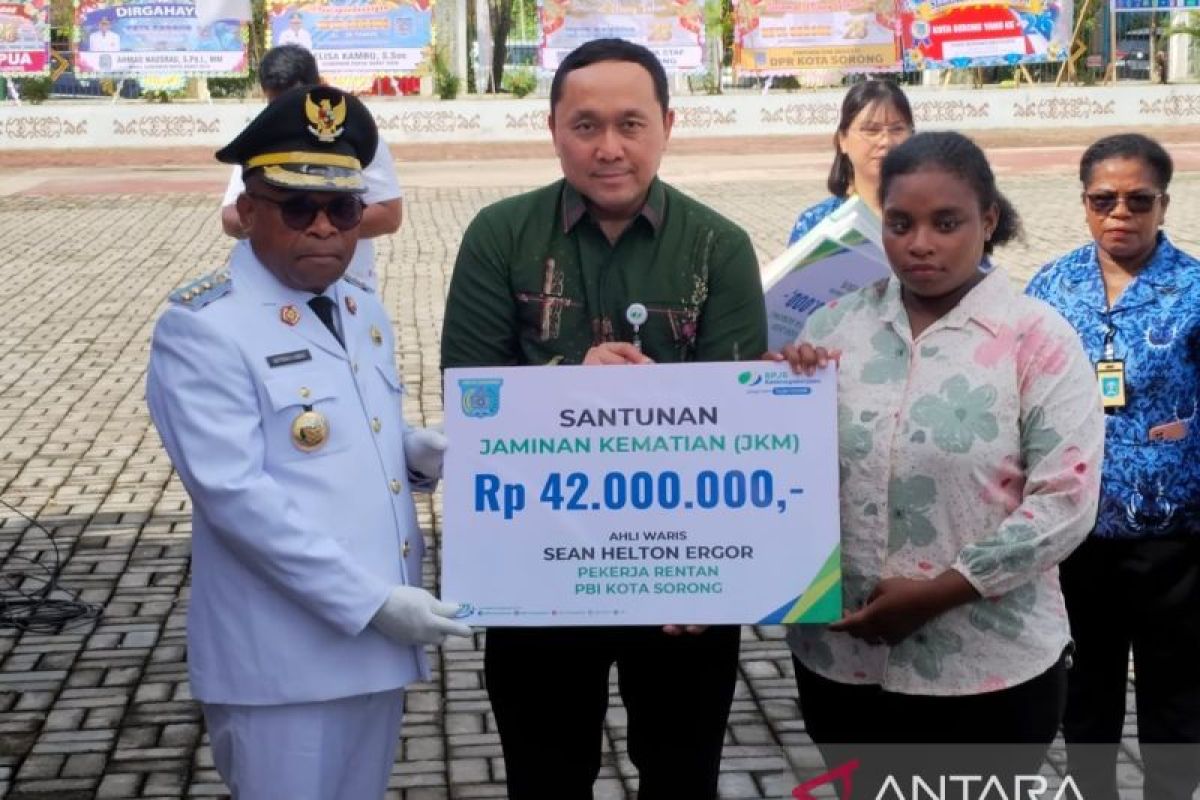 Sorong (ANTARA) - BPJS Ketenagakerjaana atau BPJamsostek Cabang Sorong menyalurkan manfaat Jaminan Kematian (JKM) senilai total Rp164 juta kepada empat ahli waris dalam momentum peringatan Hari Ulang Tahun 26 Kota Sorong, Sabtu (28/2/2026) sebagai bagian penting perlindungan pemerintah kepada masyarakat.