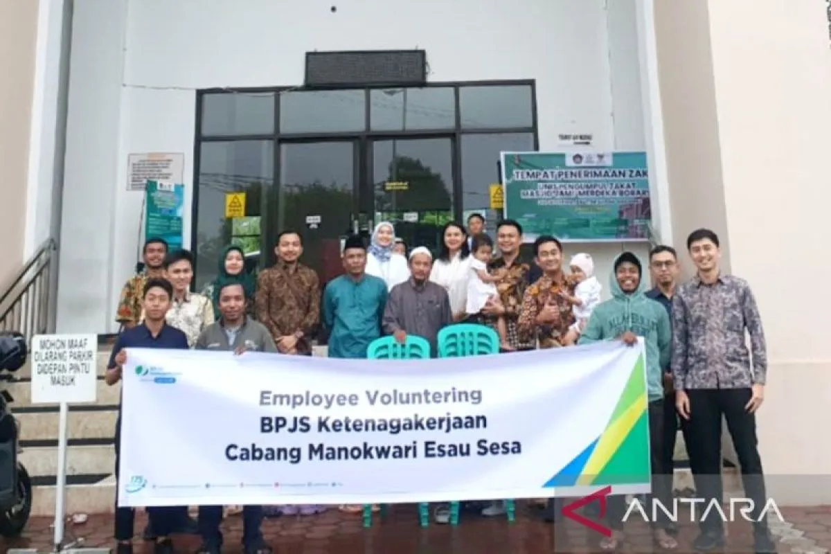 Manokwari (ANTARA) - Karyawan BPJamsostek Cabang Manokwari menggelar kegiatan employee volunteering Ramadhan 1447 Hijriah dengan menyalurkan bantuan sarana ibadah serta pembagian takjil kepada jamaah di Masjid Jami’ Merdeka, Manokwari, Papua Barat.