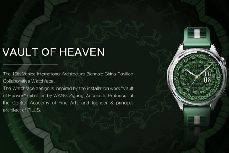 Sementara, watch face Vault of Heaven terinspirasi dari karya "Vault of Heaven" oleh Wang Zigeng, dosen Ilmu Arsitektur di Central Academy of Fine Arts dan pendiri PILLS. Karya ini menafsirkan ulang elemen arsitektur tradisional dari plafon caisson dengan menggunakan jaring pelindung hijau daur ulang dari lokasi konstruksi di Tiongkok. Dengan teknik anyaman bambu — warisan budaya takbenda — desain dinamis ini menciptakan efek visual memukau seperti phenakistoscope. Desain ini tak hanya mengapresiasi plafon caisson kuno yang melambangkan "istana surgawi" pada gaya arsitektur kuil, melainkan juga merangkai narasi berkelanjutan tentang momen-momen yang saling terhubung. Karya tersebut juga melambangkan hubungan antara gaya arsitektur kuno, filsafat alam khas Tiongkok, dan cita-cita masyarakat akan kehidupan yang lebih baik.